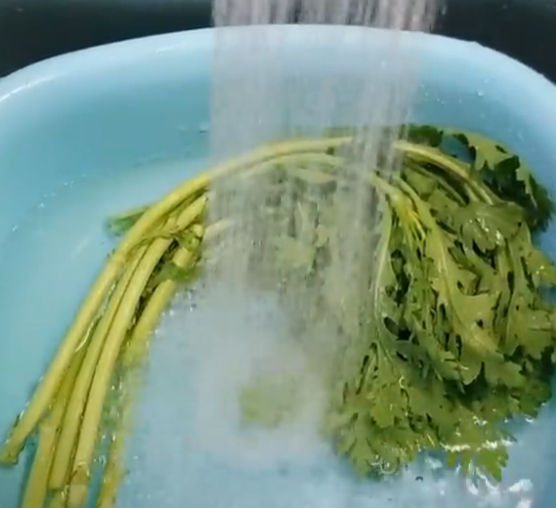- 올바른 세척 방법: 쑥갓은 수용성 비타민이 많아 장시간 물에 담가두면 영양소가 손실됩니다. 흐르는 물에 짧게 씻는 것이 좋습니다. 볼에 물을 담아 줄기를 잡고 쑥갓 잎을 흔들어 씻어주세요.