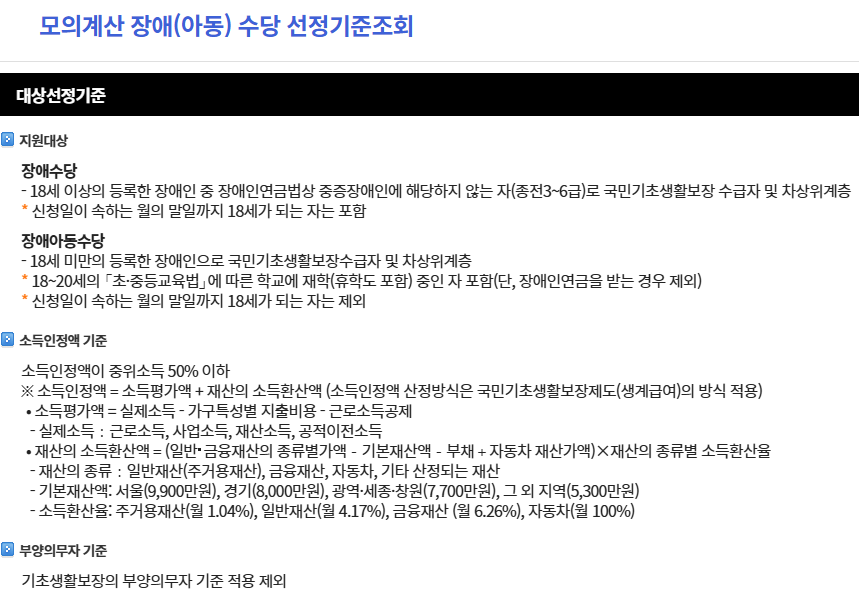 - 경증장애인 수당: 소득 수준에 따라 차등 지급 (월 250,000원 ~ 550,000원)